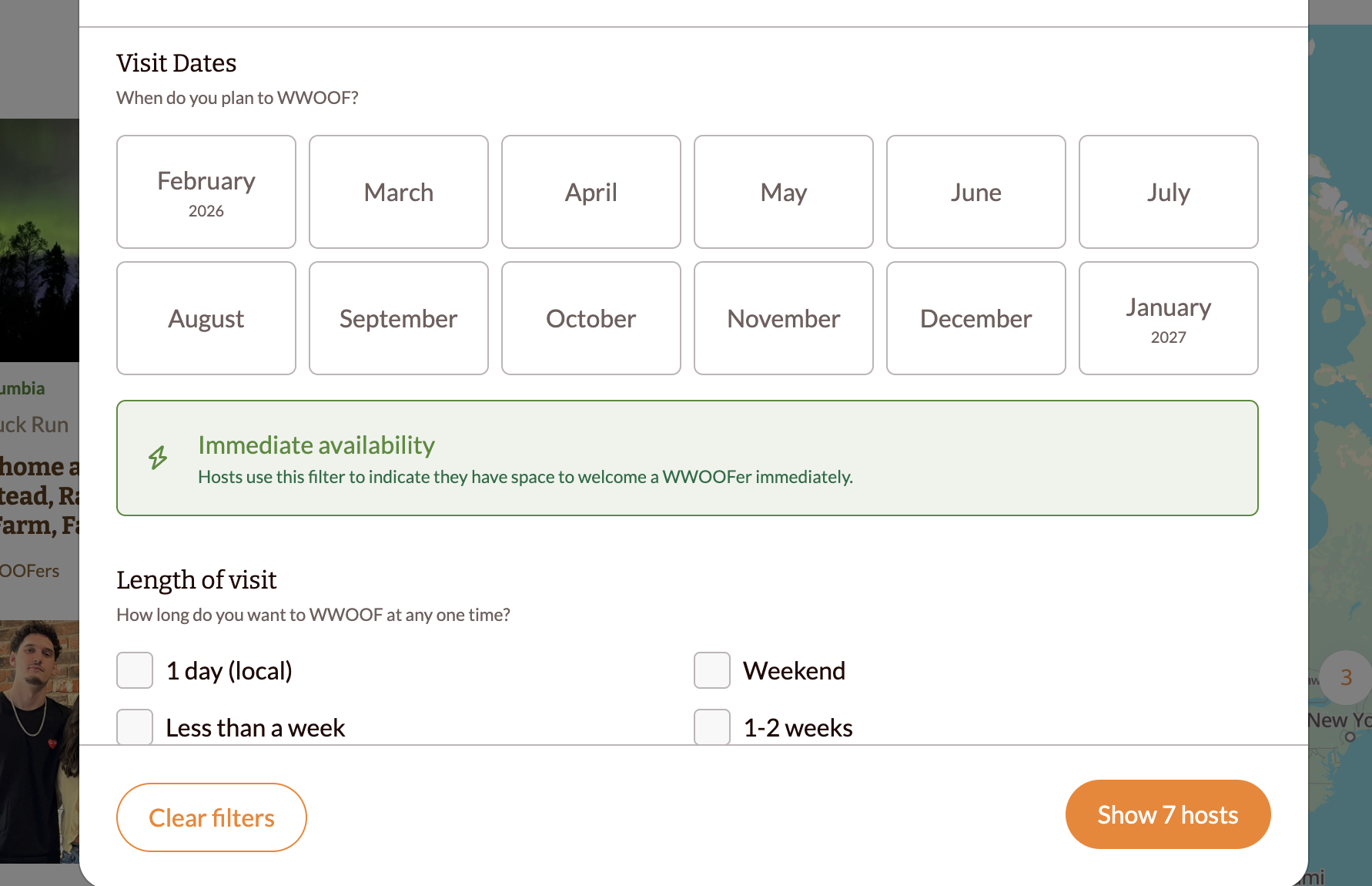 Hôtes : Nous avons ajouté une nouvelle fonctionnalité qui vous permet d’indiquer si vous êtes disponible immédiatement pour accueillir des WWOOFeurs et WWOOFeuses. Activez cette option dans votre profil, sous « Disponibilité », et votre profil sera mis de l’avant dans la liste d’hôtes comme étant disponible immédiatement pendant 10 jours. Cela aide les WWOOFeurs et WWOOFeuses à vous trouver plus rapidement et à accroître le nombre de demandes de visite que vous recevez.